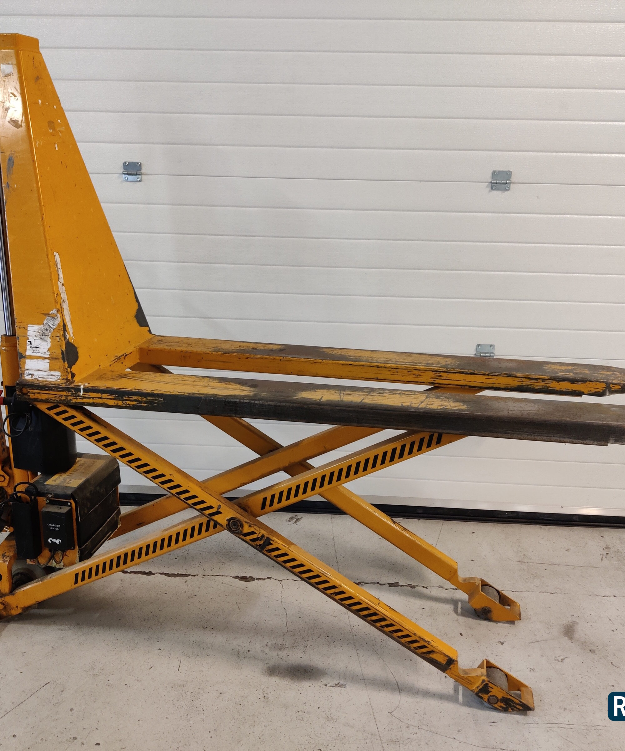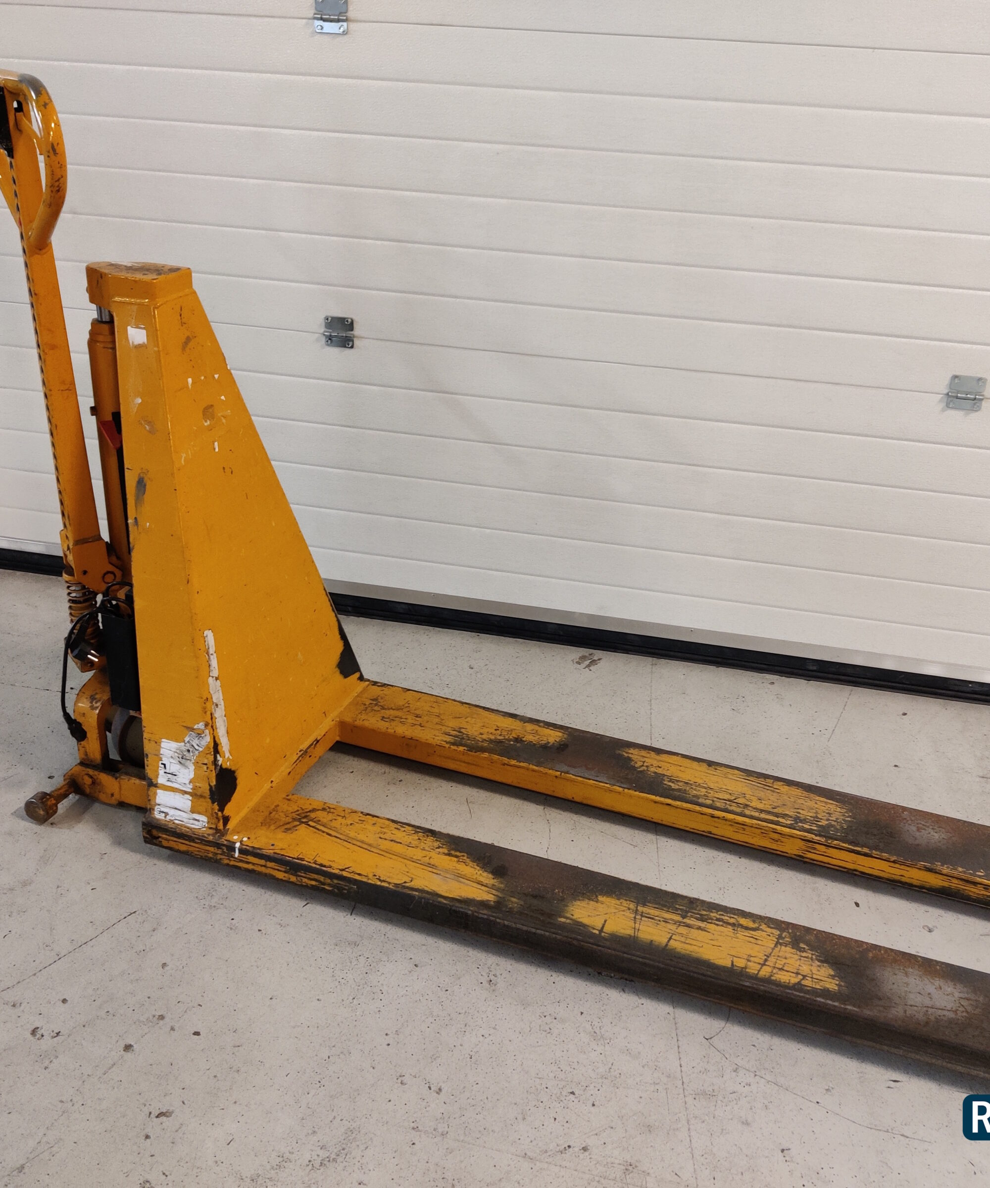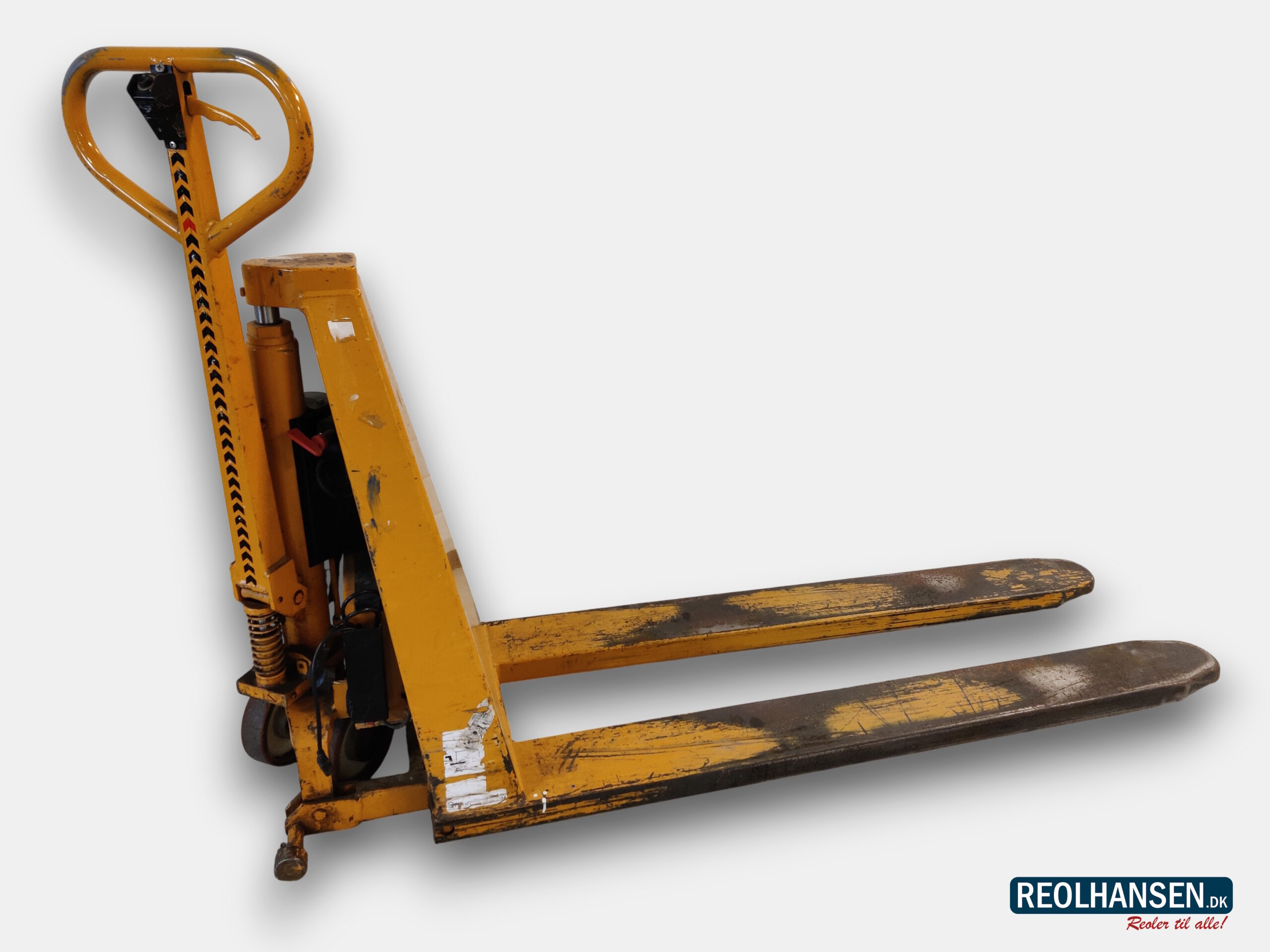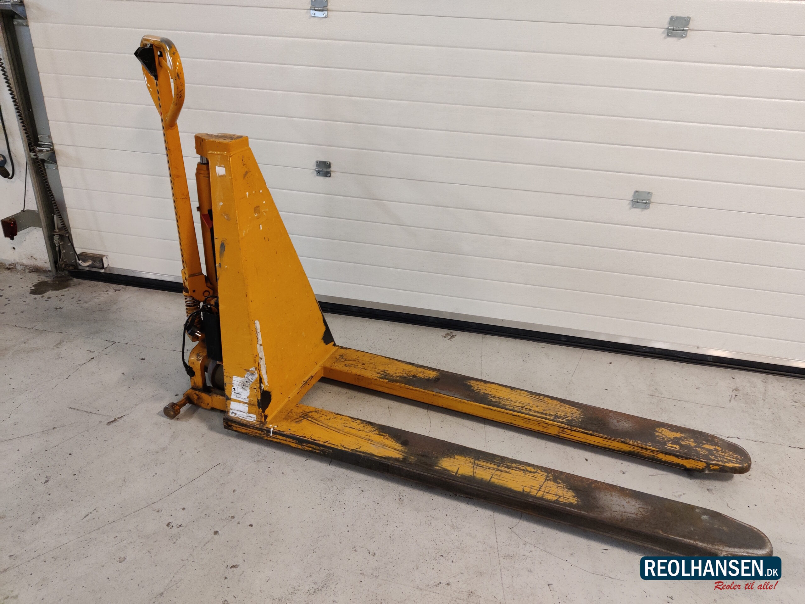Brugt Semielektrisk sakseløfter/pallevogn med ekstra lange gafler.