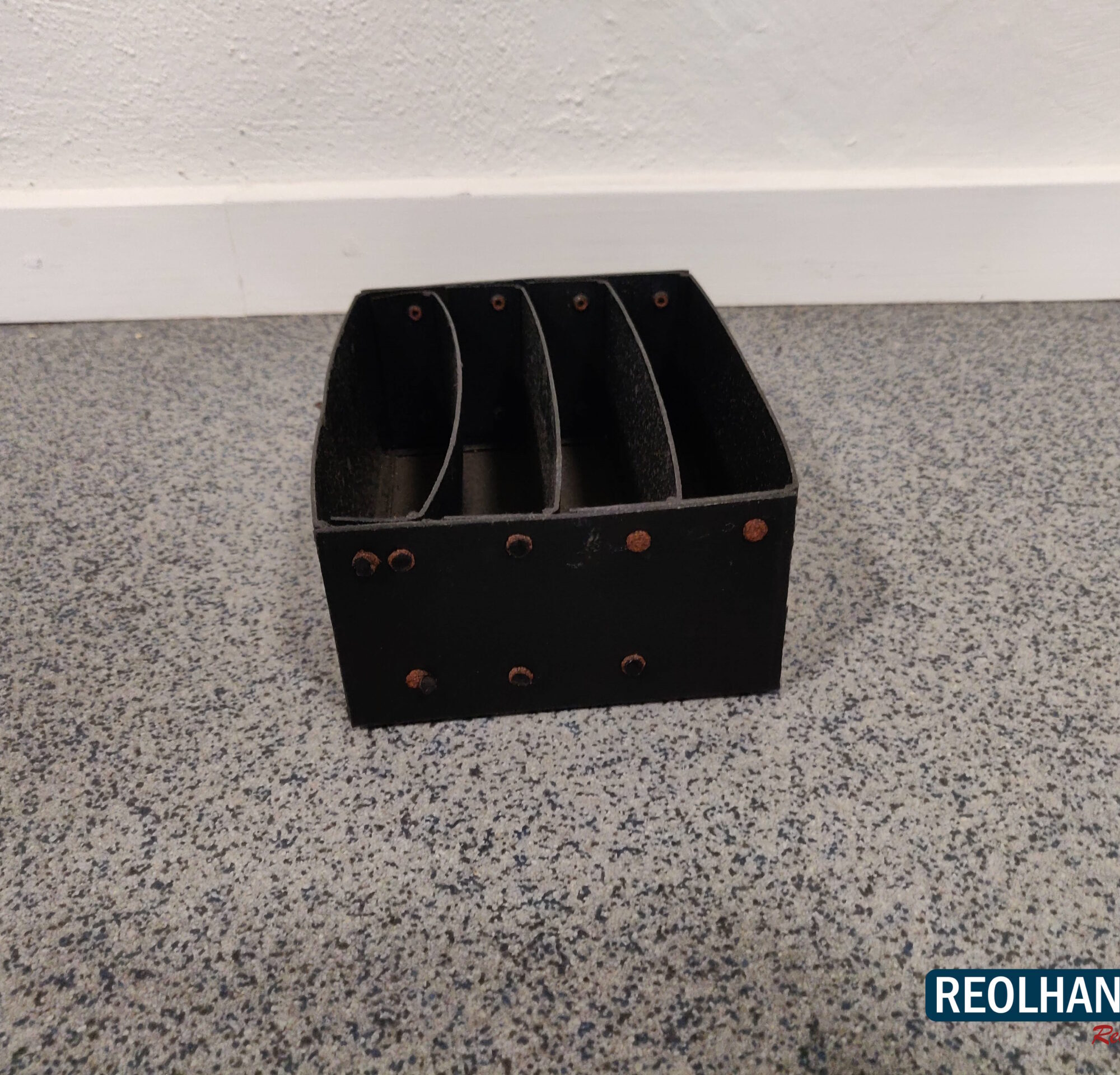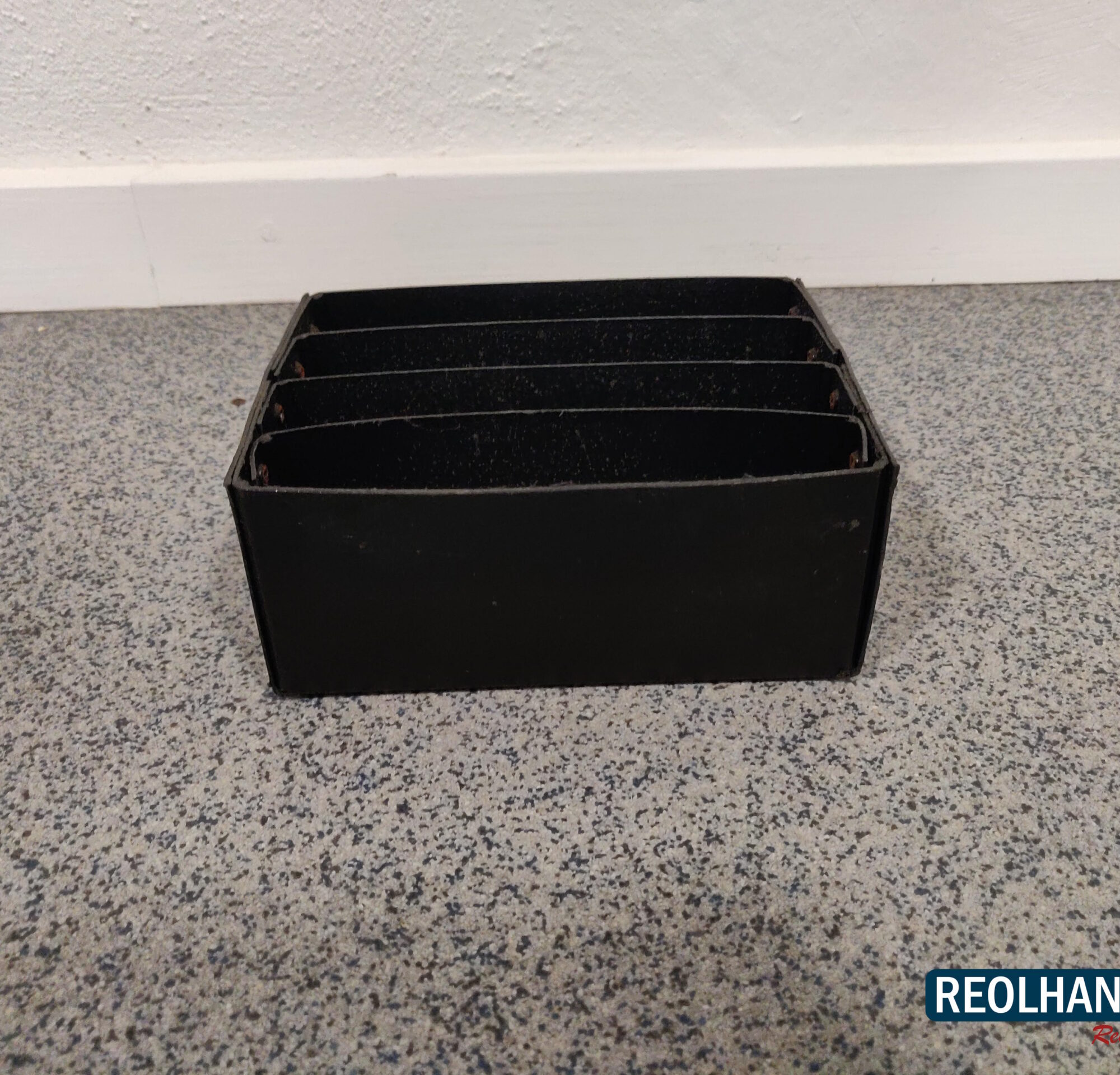 Brugt fiberkasse delt op i 4 små rum, velegnet til sortering og opbevaring af mindre og små genstande.