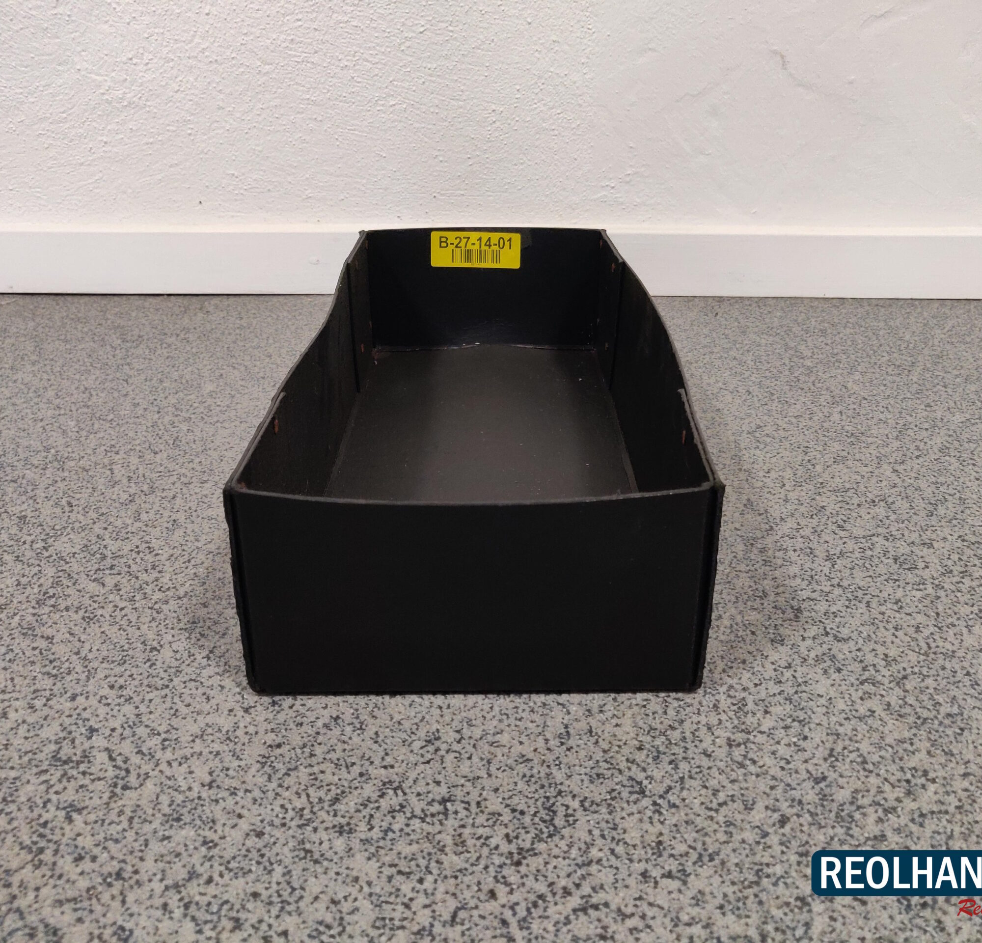 Kassen er fremstillet i sort plastfiber, hvilket giver en fleksibel og holdbar kasse.