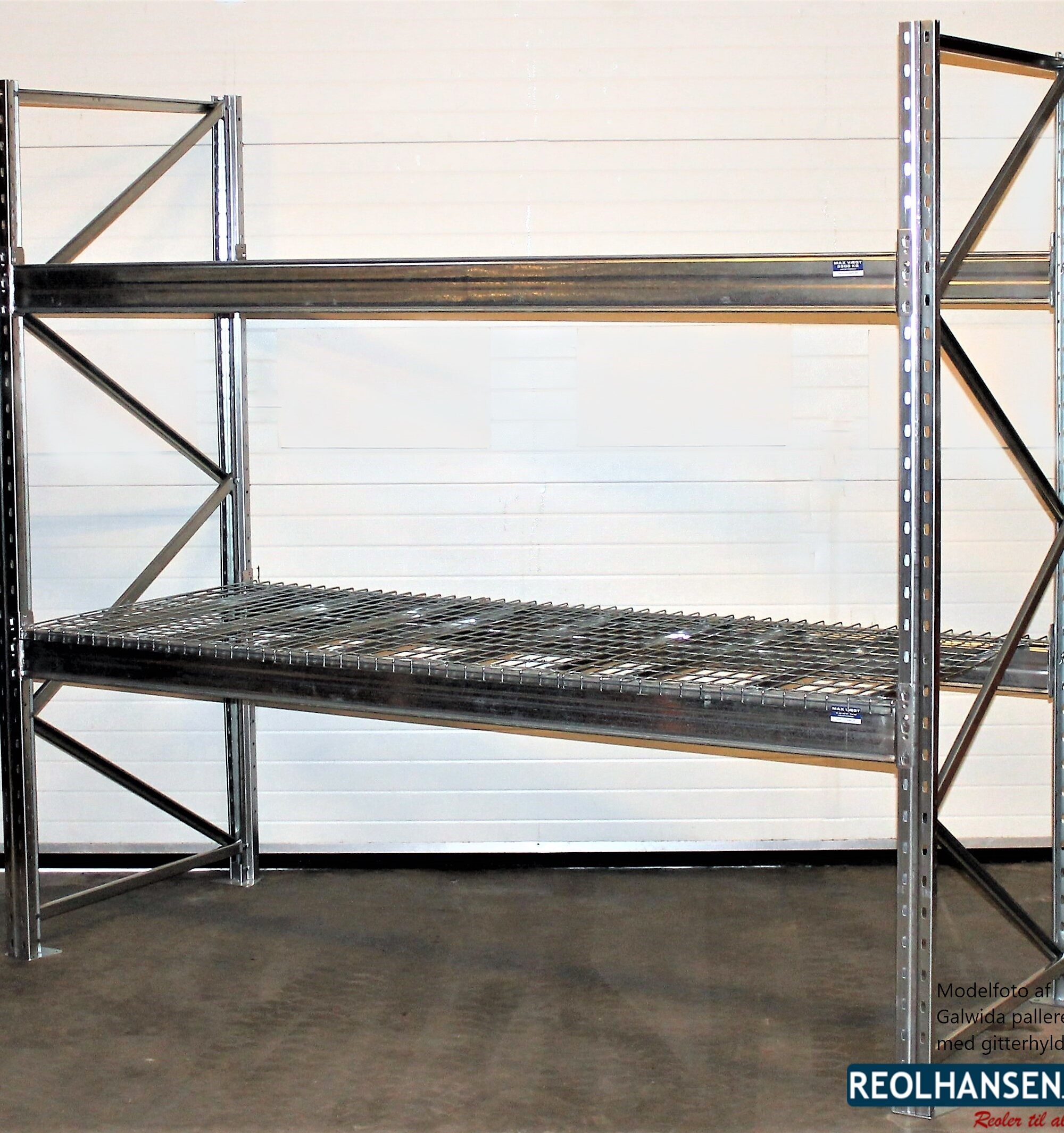 Galwida er en model som vi har importeret siden 2005, og derfor kender vi den fra top til bund. Den er fremstillet i pre-galvaniseret stål. Kraftig udført i 1,5 mm S235. Testet af teknologisk institut. Reolstiger leveres samlet, og i den dybde som passer til dine paller. Reolbjælkerne kiler ikke fast, og det er nemt at løfte en bjælke op for at genplacere og ændre højde, eller hvis du skal flytte reolen. Det unikt udformede hulmønster gør det nemt at styre bjælkens gribere på plads. Når bjælken sænkes ned glider griberne automatisk i lås, og derved opnår reolen stor stabilitet, nem montage af låsesplitter sikrer at sikkerheden er i orden.