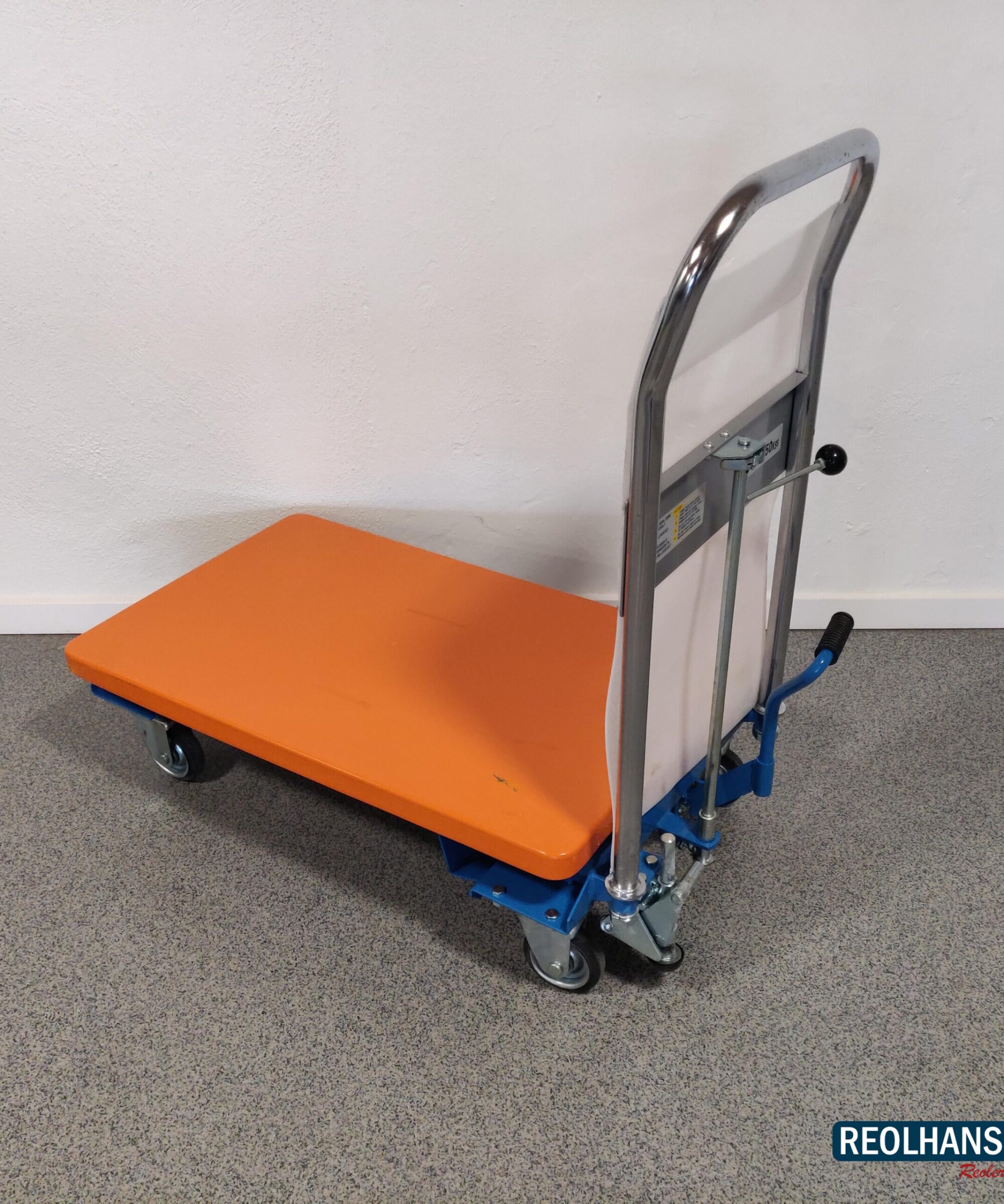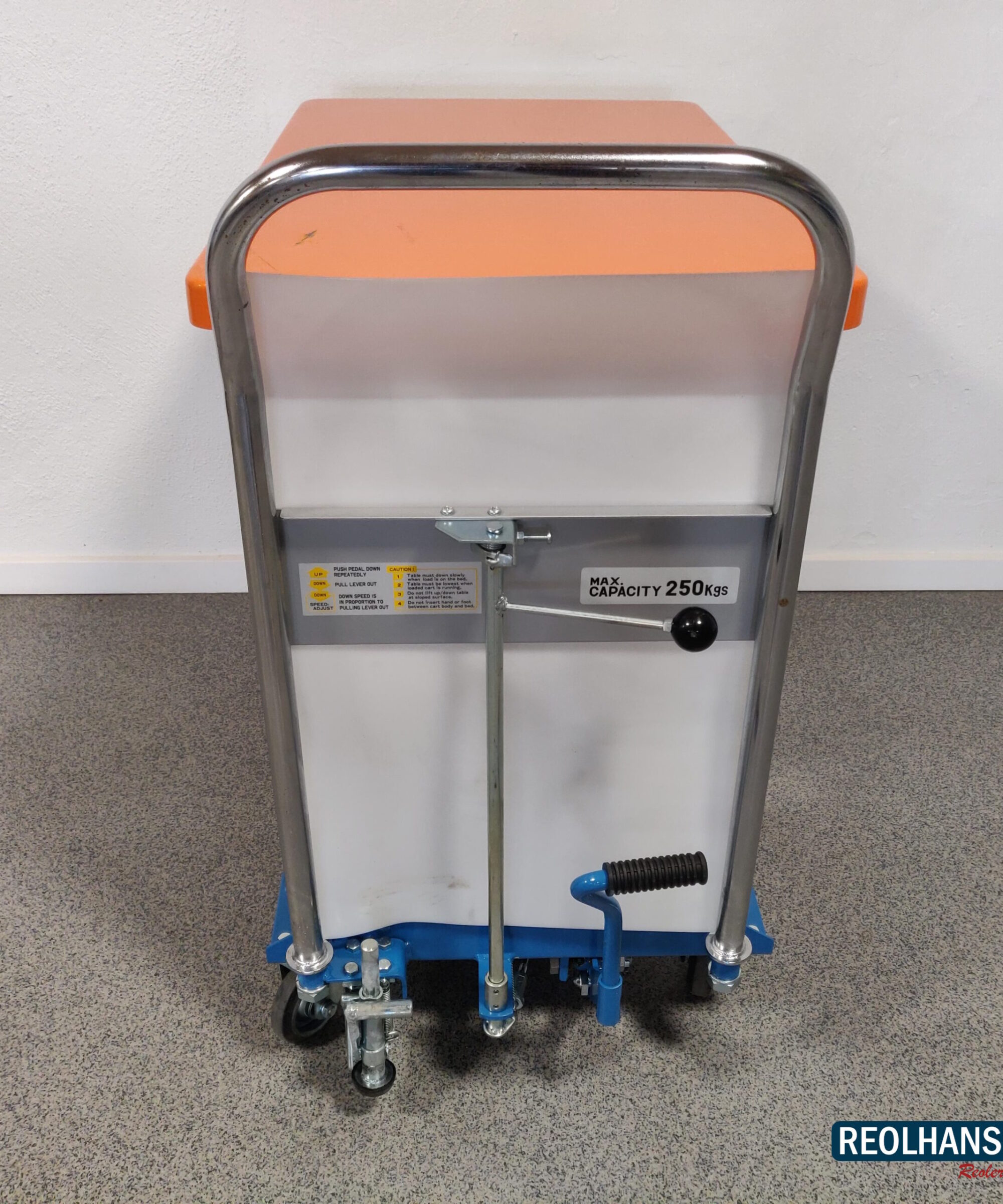 Denne løftevogn Max 250 kg har fire drejelige hjul bagved, dette gør den nem at styre både ved høj og lav belastning.