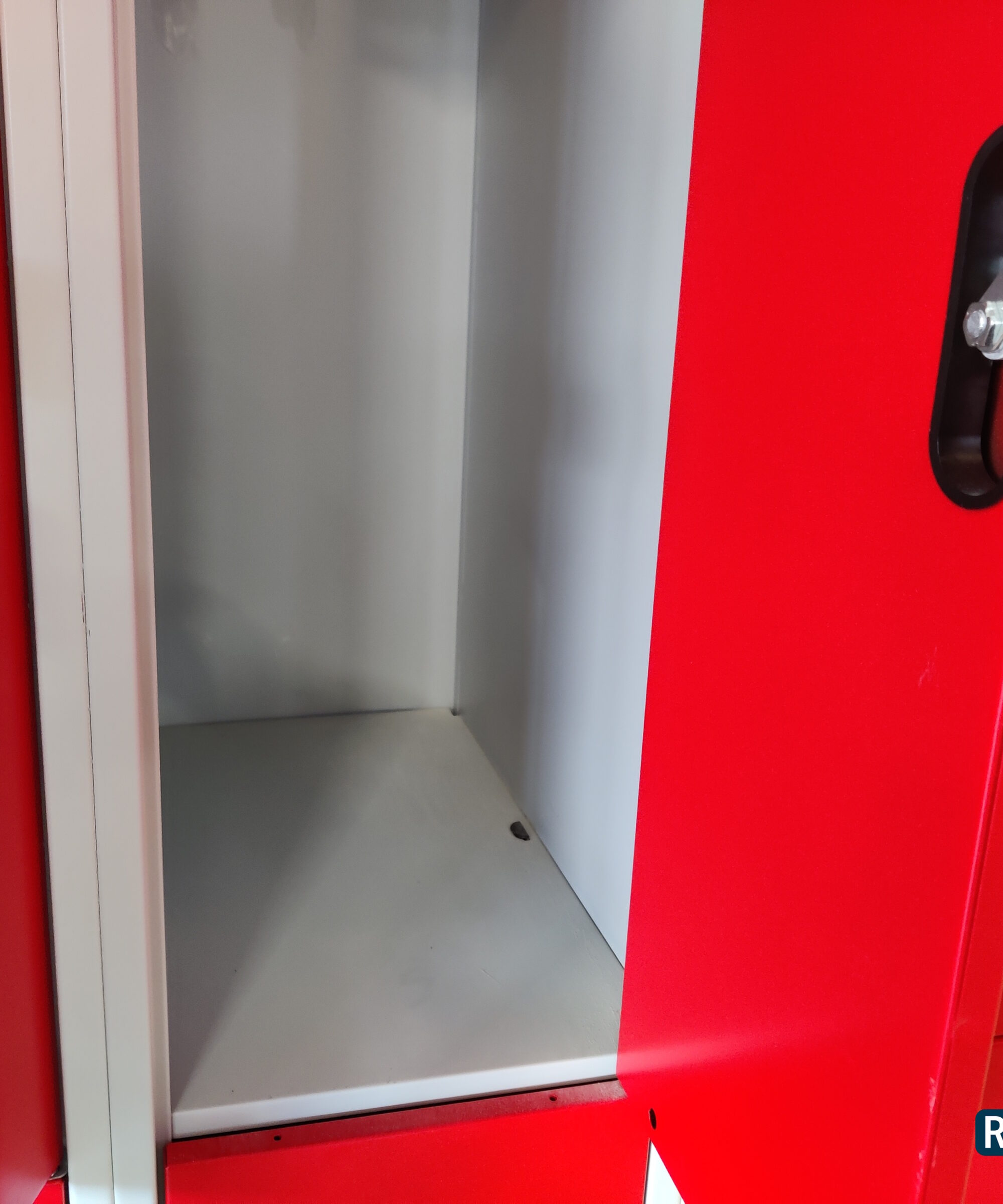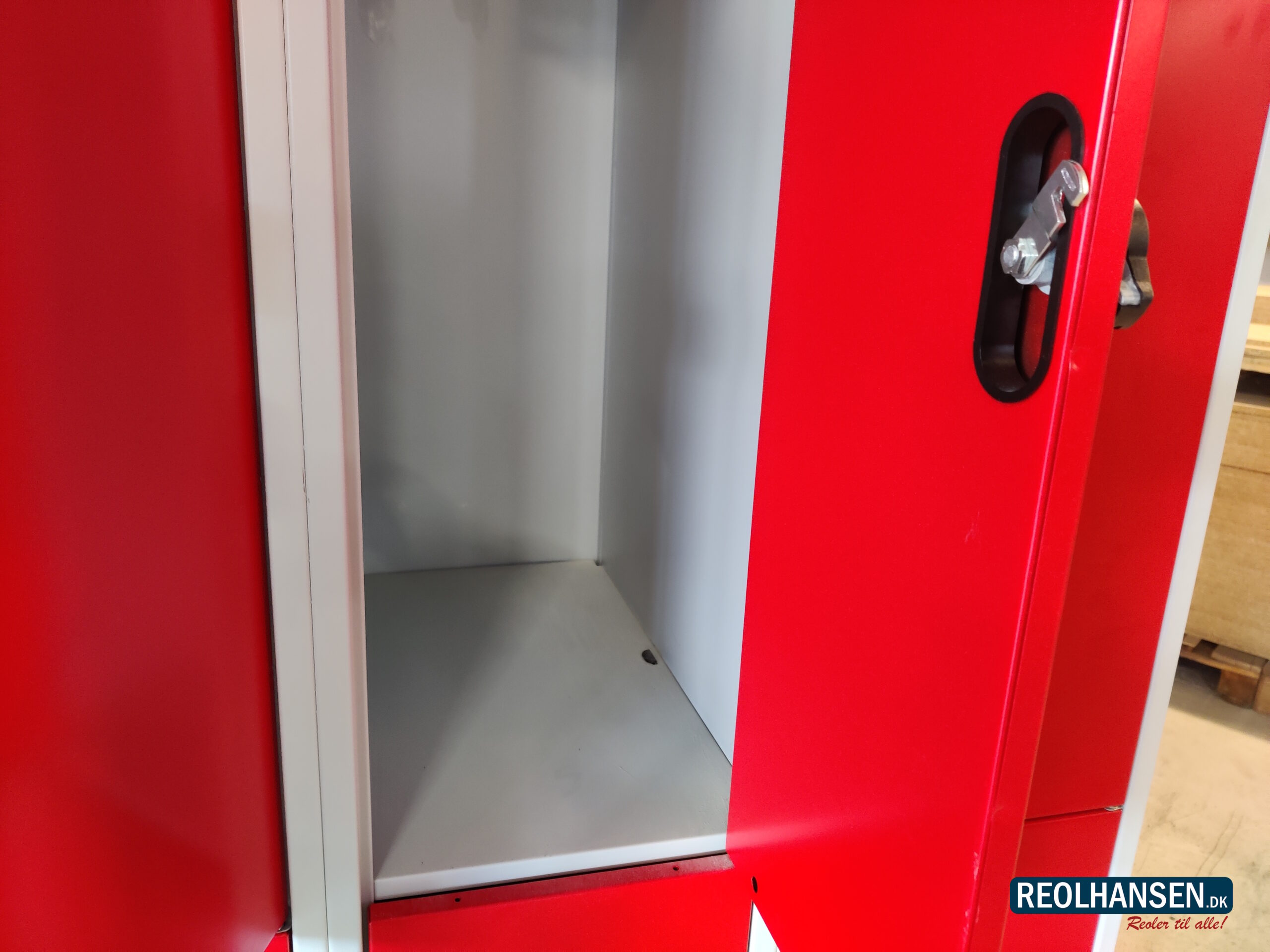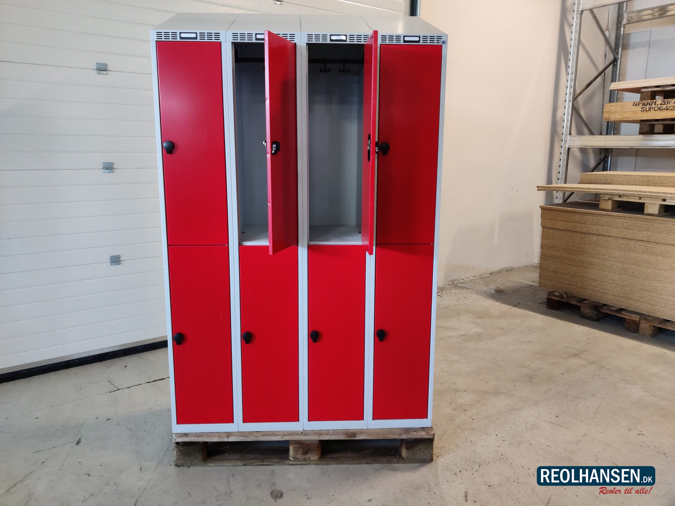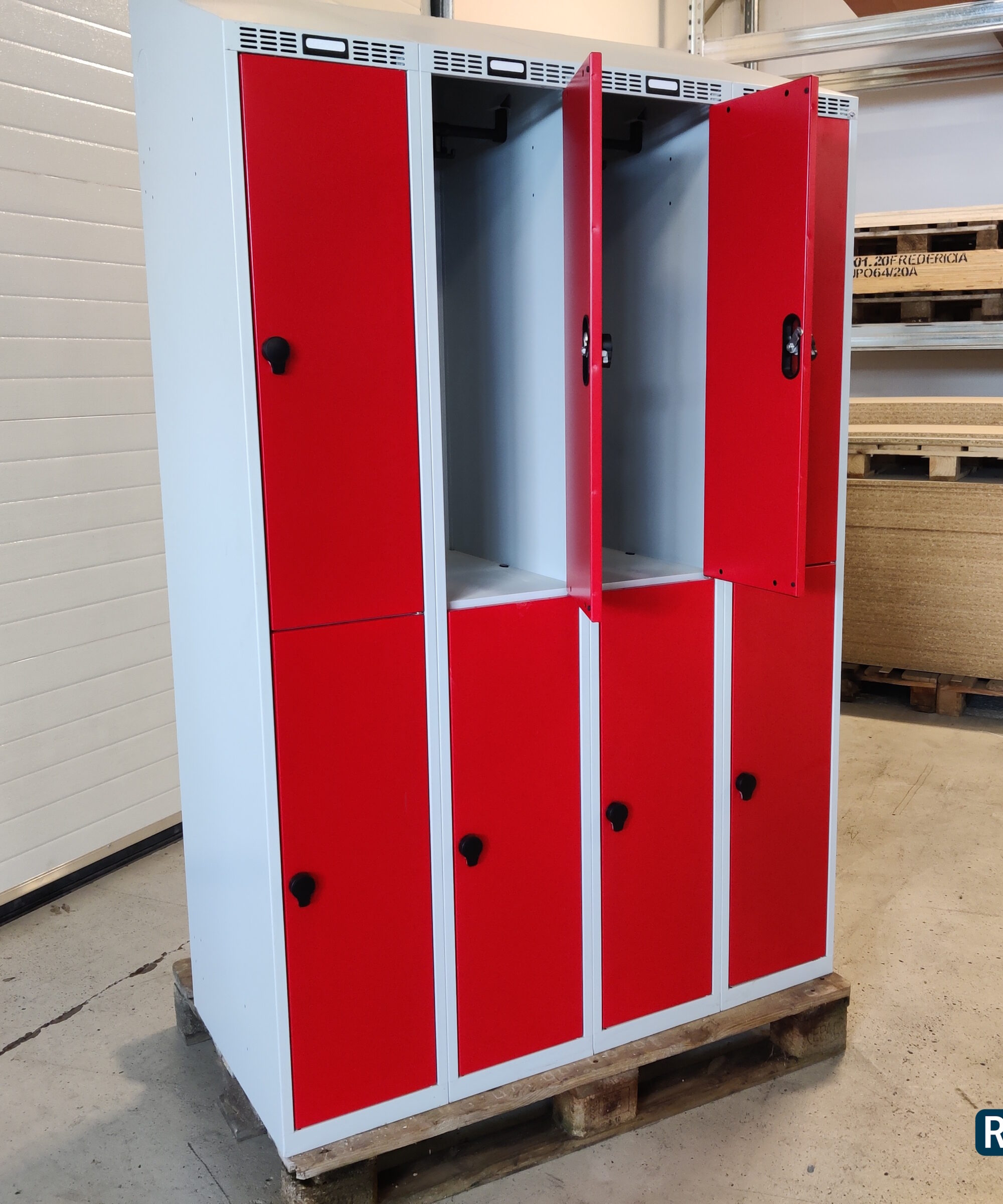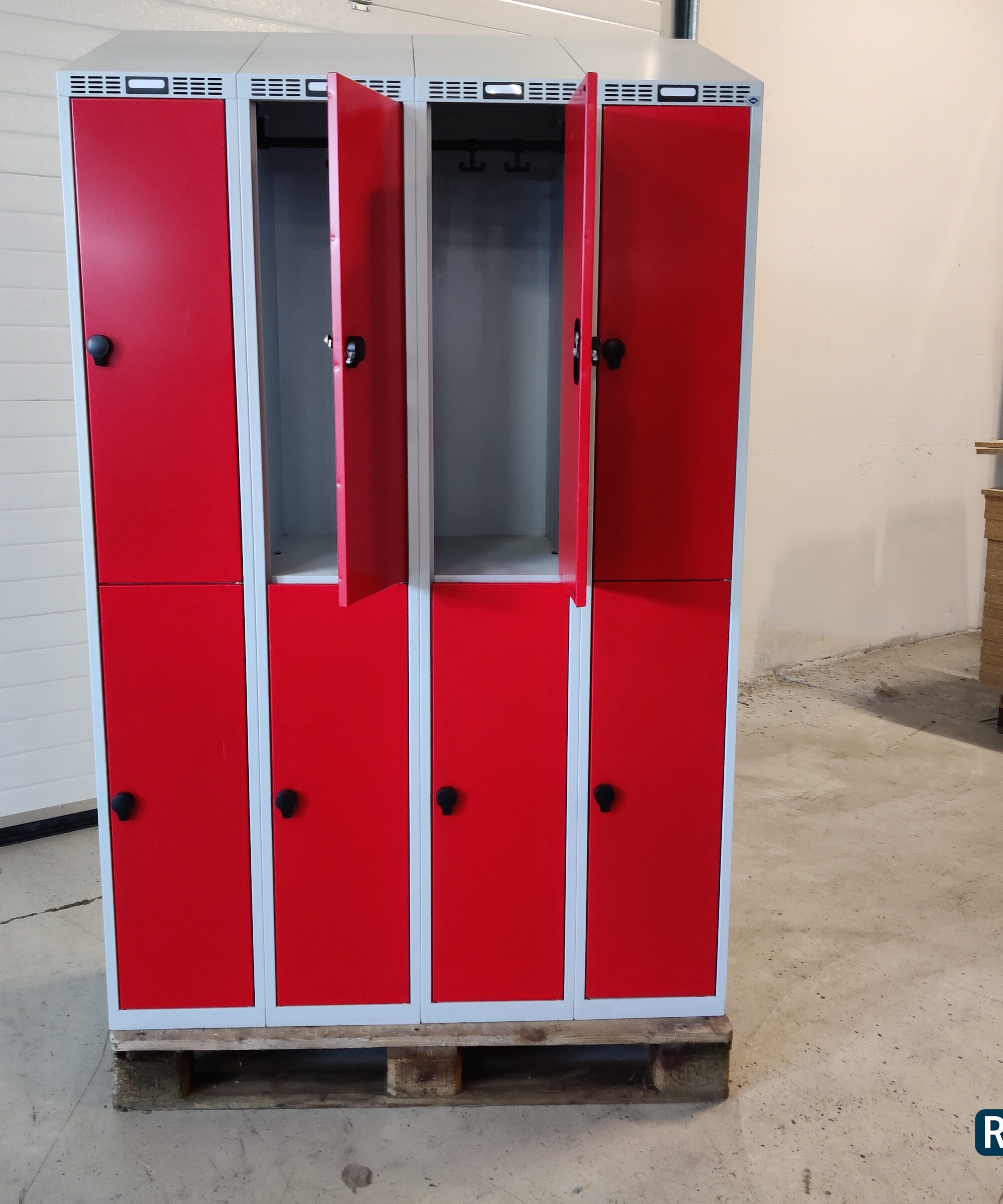 Brugt garderobeboks i metal med 8 røde 1/2 halvlåger