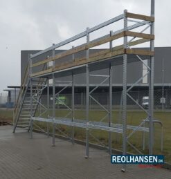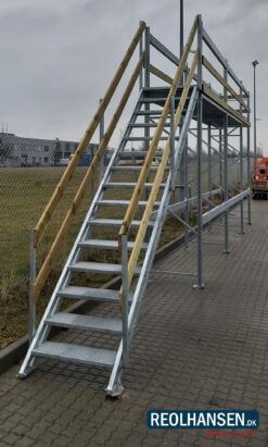 Et priseksempel der er 7,5 m lang, og hvor der er brugt 4 reolstiger og trappen har gelænder i træ.